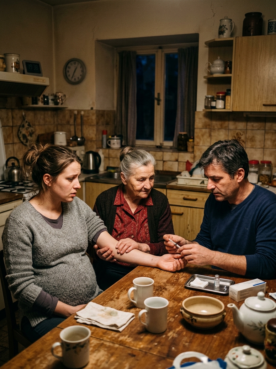 Tina je stala sredi majhne kuhinje in opazovala, kako si njen mož Andrej z očitnim užitkom reže debel kos sočne svinjske zarebrnice. Vonj pečenega mesa je napolnil prostor, tako močan in mamljiv, da se ji je ob osmih mesecih nosečnosti želodec boleče skrčil. Zadnje tri mesece ji je hemoglobin vztrajno padal, ginekologinja ji je predpisala železo in ji skoraj zabičala: govedina, jetra, granatna jabolka.