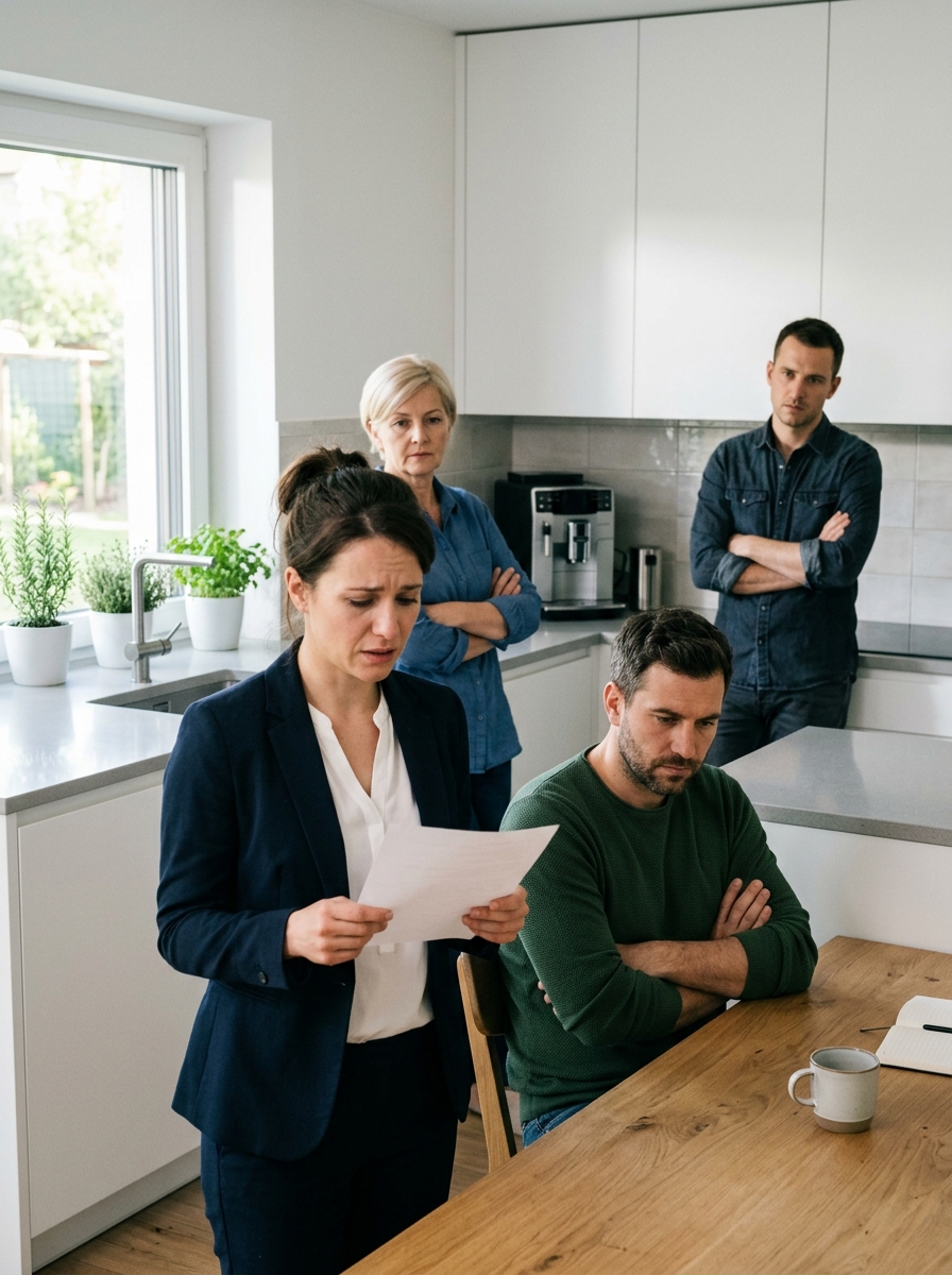 Obrnila se je in brez oklevanja stopila v kuhinjo — tako, kot stopiš v prostor, ki je nedvomno tvoj. Za mizo je sedel Žan: sveže obrit, v svetli srajci, s skodelico čaja v roki. Deloval je, kot da ni tu začasno, temveč da ima rezervacijo za nedoločen čas. Na okenski polici, kjer je običajno stal njen fikus, je ležal telefon na polnilcu — tih dokaz, da si je nekdo že prisvojil kotiček prostora.
