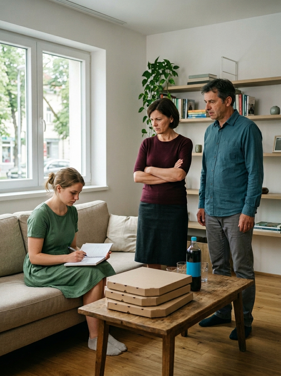 Matej je stal sredi dnevne sobe, roke prekrižane na prsih, čeljust napeta.