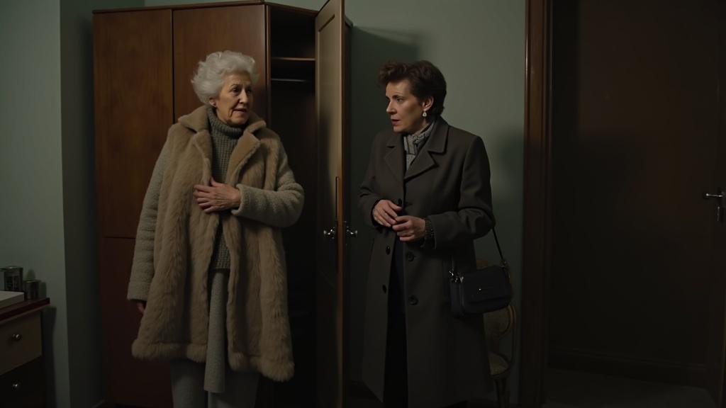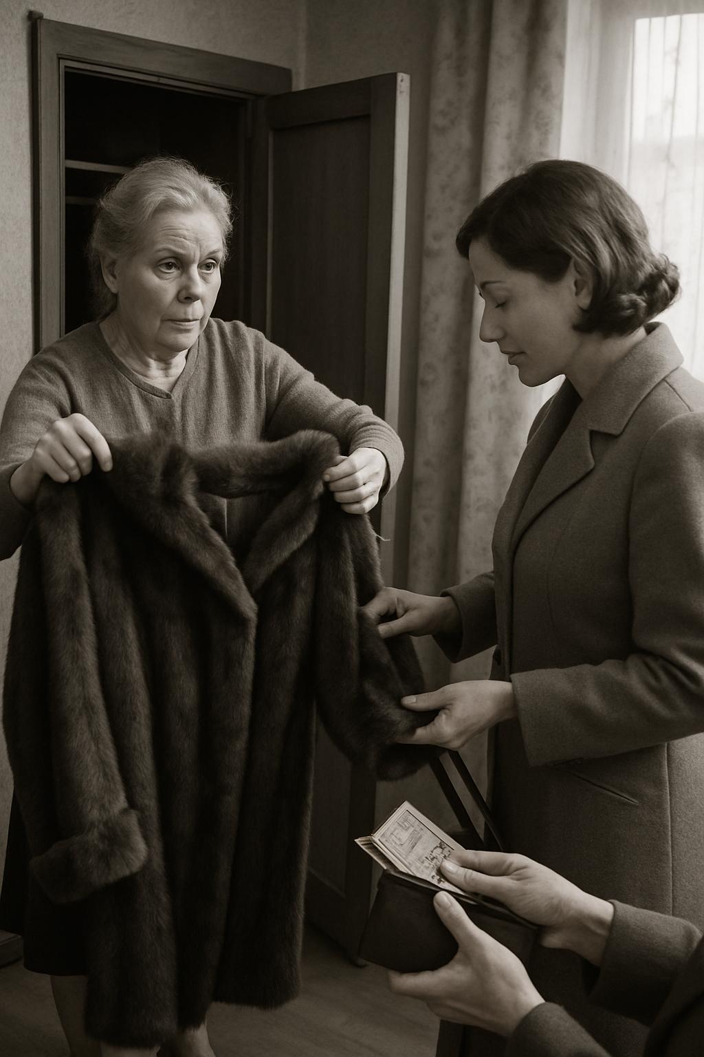 Plašč je začela stresati pred neznano gospo, kot da bi dokazovala njegovo brezhibnost. Ženska je z očitnim zanimanjem tipala mehko krzno, preverjala šive in kimala. Med njima je potekal tih, a zgovoren pogovor, dokler gospa ni segla v torbico, izvlekla denarnico in iz nje vzela bankovce.