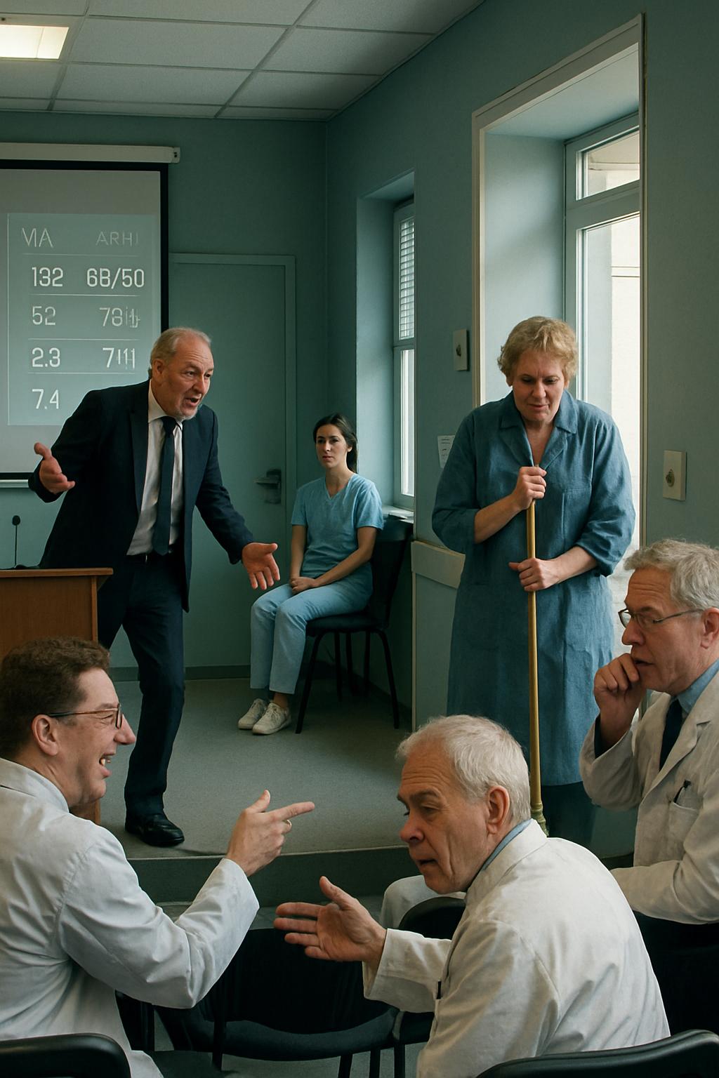 — Morda bi poklicali še čistilko? Naj nam ona postavi diagnozo, kaj pravite? — je s pikrim posmehom odmeval glas direktorja bolnišnice po konferenčni dvorani.