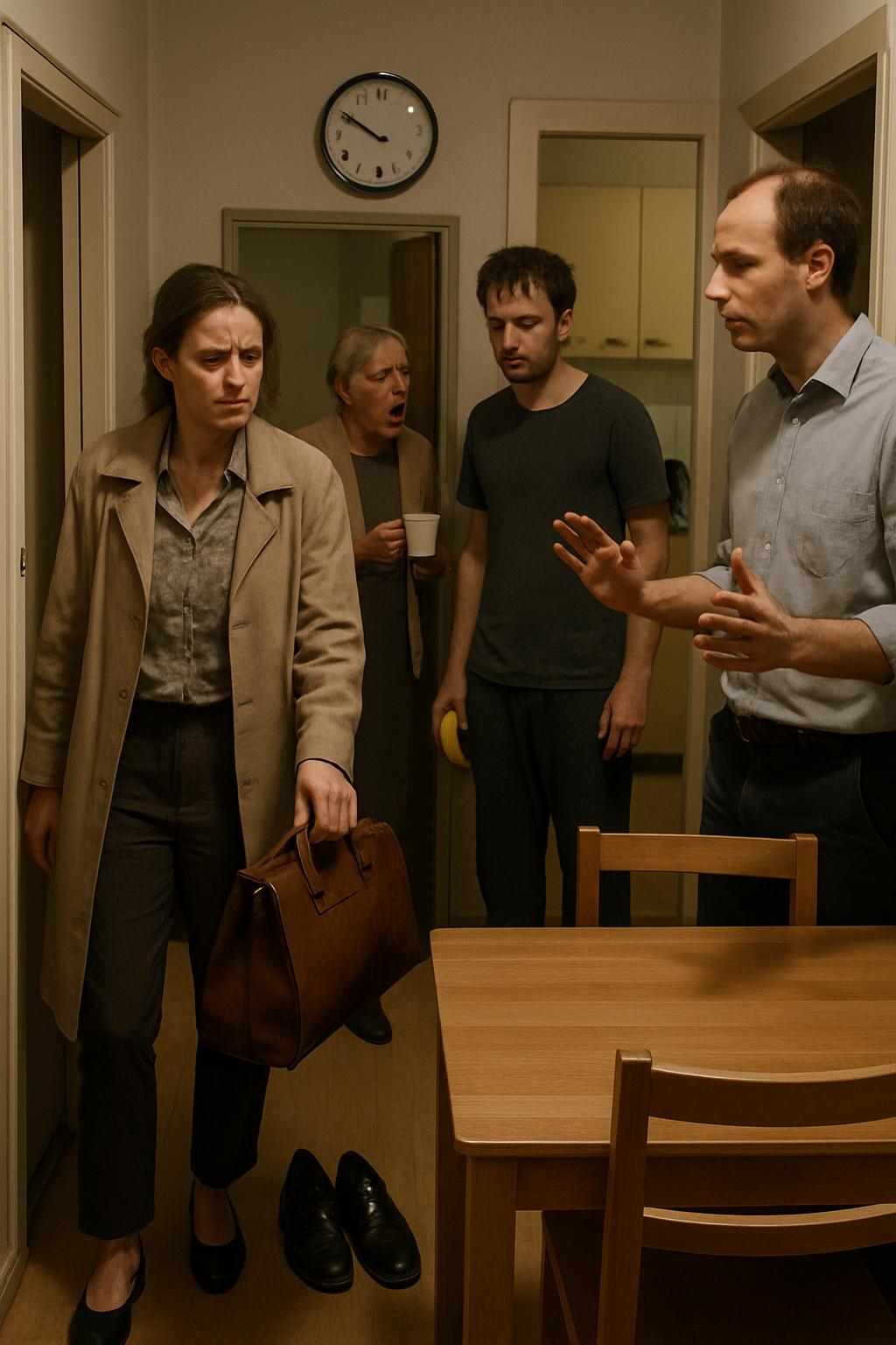 Ko je ključ zasukala v ključavnici, se je oglasilo znano škripanje, kot da bi vrata sama vzdihnila od dolgočasja. Sezula je čevlje in skoraj pohodila par moških čevljev, skrbno postavljenih ob steno – novi, bleščeči. Gorazd Rusjan je bil doma. Kako prikladno.