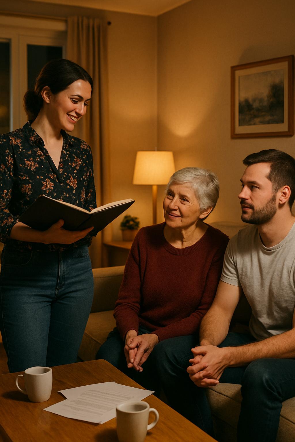 Pred blokom je parkirala, vzela mapo in se povzpela do petega nadstropja. Ključ je tiho zaskočil v ključavnici. Ko je odprla vrata, so iz dnevne sobe prihajali glasovi – prepoznala je moža Gorazda Goloba in njegovo mamo Albino Pungartnik. Katarina je sezula čevlje, obesila plašč in stopila naprej.