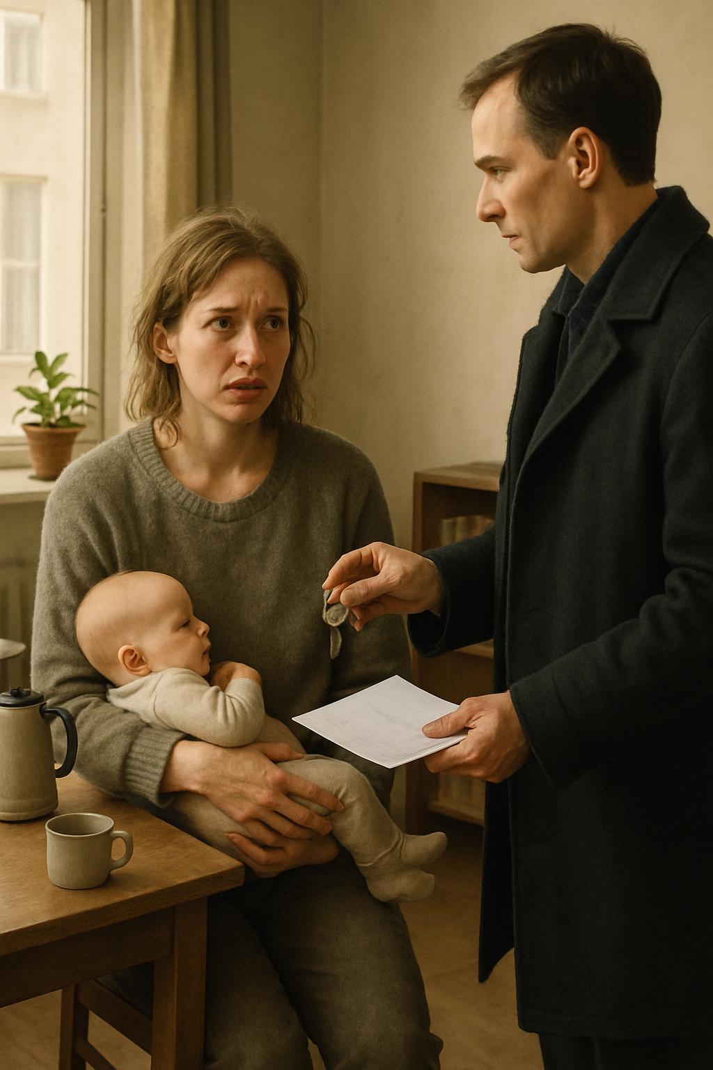 »Mojca, počakaj, nikamor ti ni treba oditi. To stanovanje je zdaj tvoje. Tvoj mož si je pred časom pri meni izposodil denar za nakup, pa ga nikoli ni vrnil. Dolg sem poravnal tako, da sem prevzel nepremičnino. Umiri se in ostani tukaj s sinom, kolikor dolgo želiš.«