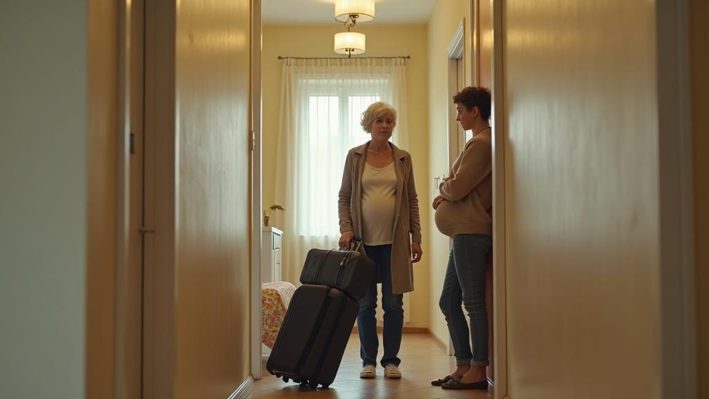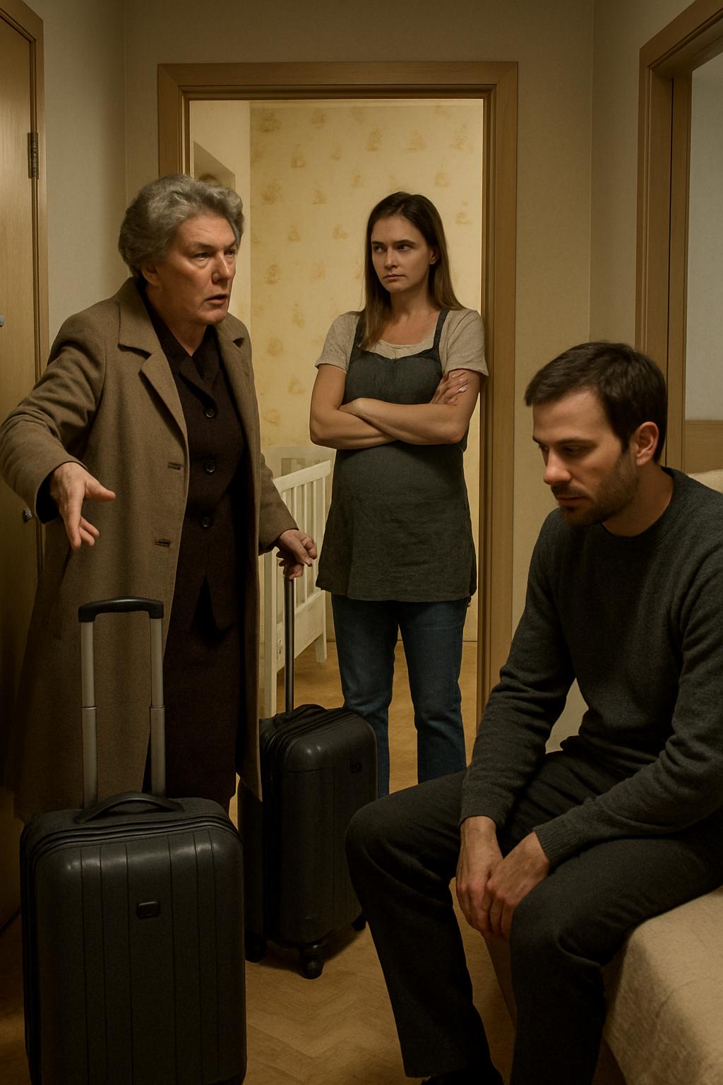 Pokorno ji je sledil, kovčke pa pustil sredi hodnika. Ko so se vrata zaprla, se je Tjaša obrnila proti njemu in prekrižala roke. Govorila je tiho, skoraj šepetaje — ni si želela, da bi tašča že v prvih minutah bivanja slišala prepir.