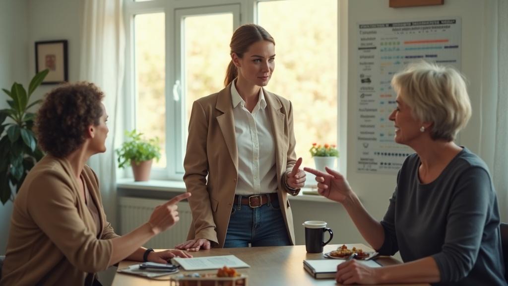 »Mia… jaz… no… jaz pač…«, začne mencati Nika, a ko opazi tišino in poglede sodelavcev okoli sebe, samozavestno reče: »Bom pripravljena. Saj imaš vse pod nadzorom.«