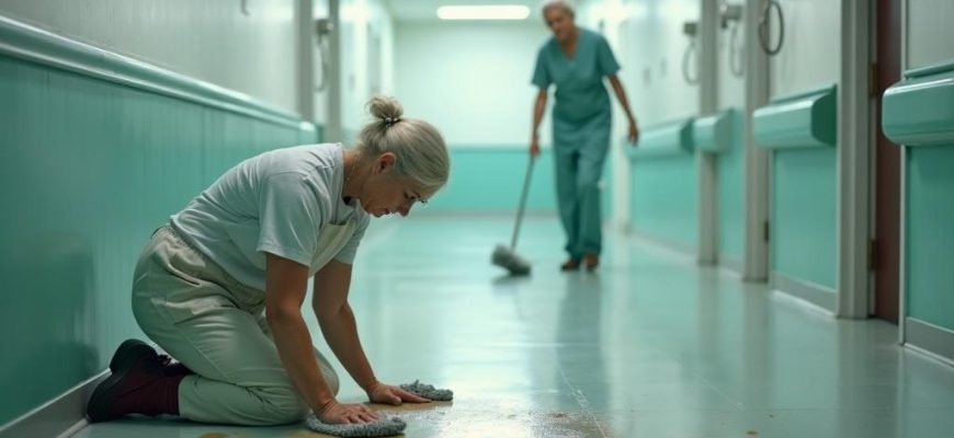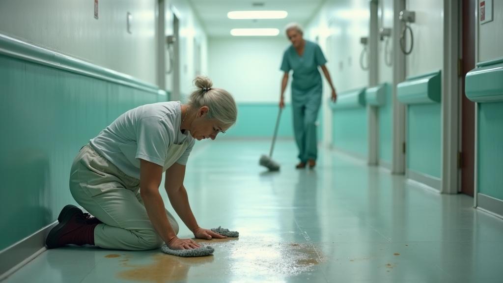V medlem sijaju bolnišničnega hodnika je Zala Jazbec klečala na linoleju in z grobo krpo drgnila zasušeno madež. Kot bi z vsakim potegom poskušala izpraskati del lastne preteklosti. Po zraku je rezko dišalo po razkužilu, a še bolj po hladni brezbrižnosti ljudi, ki so hodili mimo.
