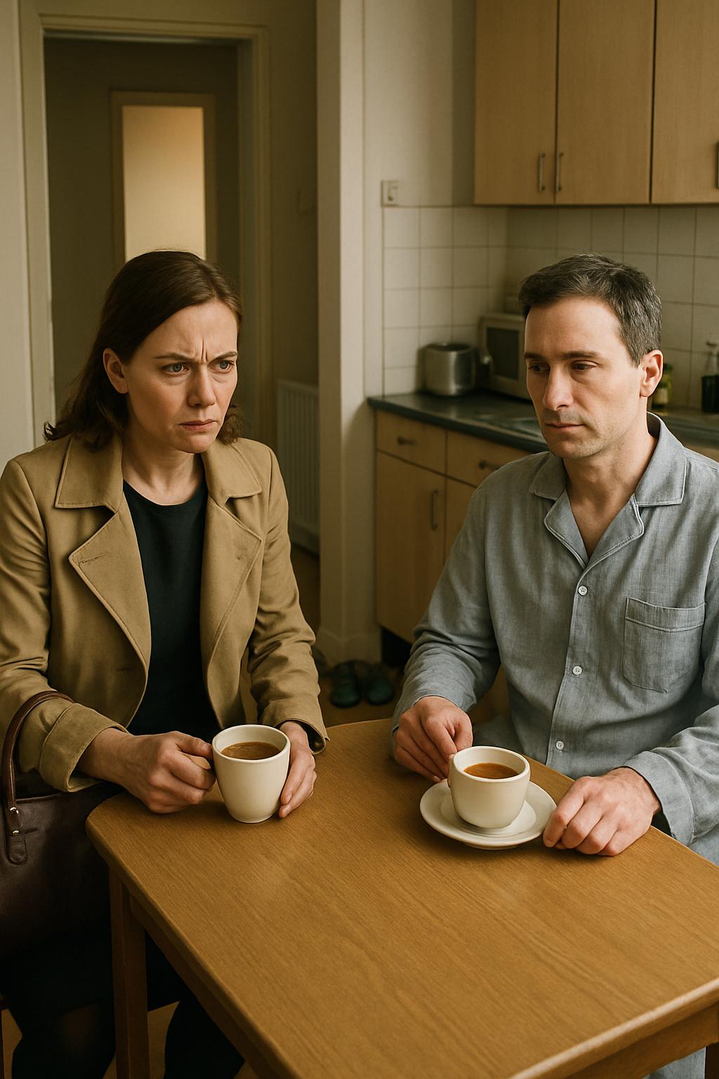 Gorazd je globoko vzdihnil. Zunaj je zalajal sosedov pes in nenavadno poudaril nesmiselnost prizora: tuji copati, mož v pižami, ki igra brezbrižnost, in občutek, da stanovanje ni več povsem njuno.