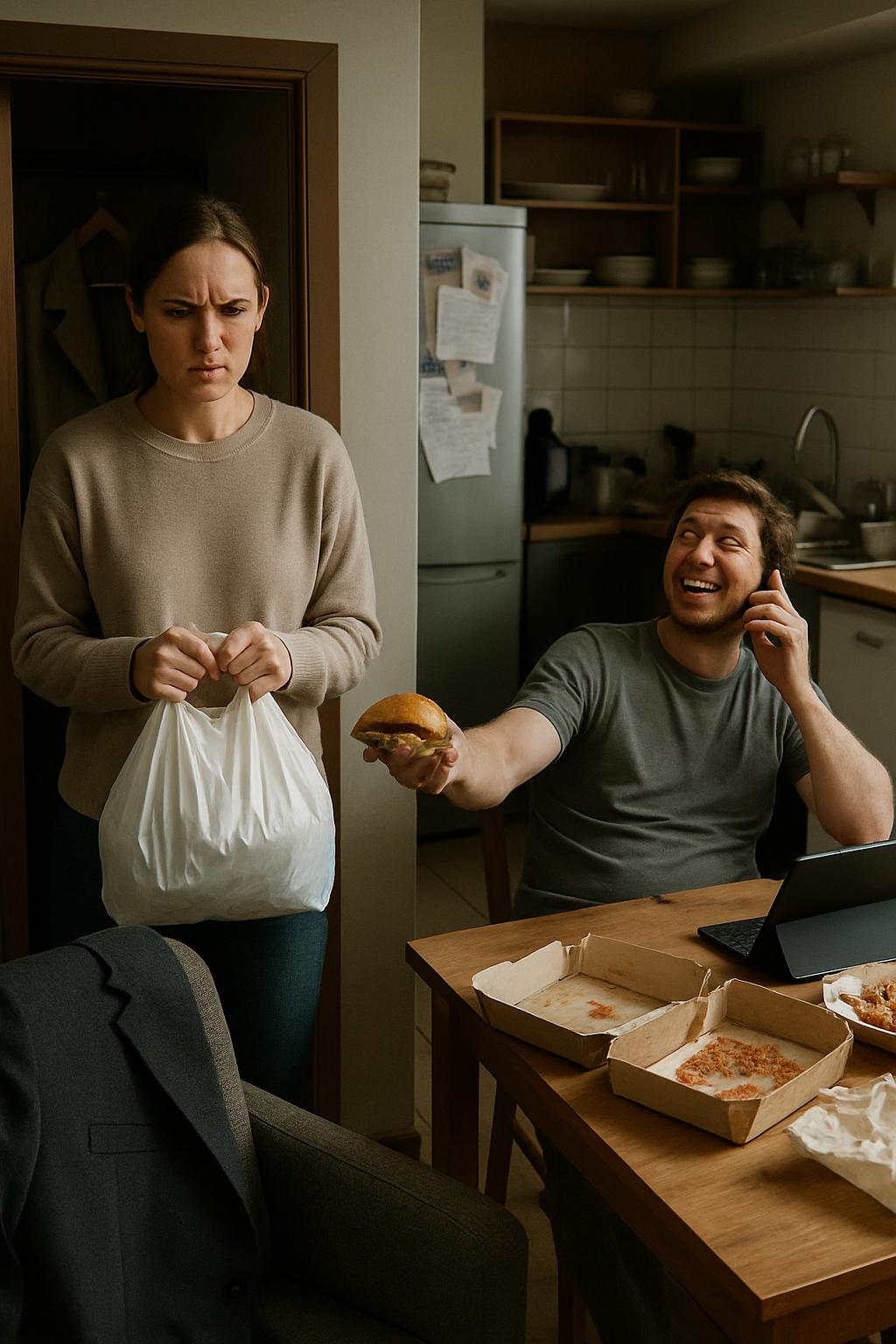 Na mizi so se kopičile prazne škatle pic in burgerjev. V koritu je bila gora neumite posode, štedilnik pa je sameval — o obljubljenih polpetih ni bilo sledu.
