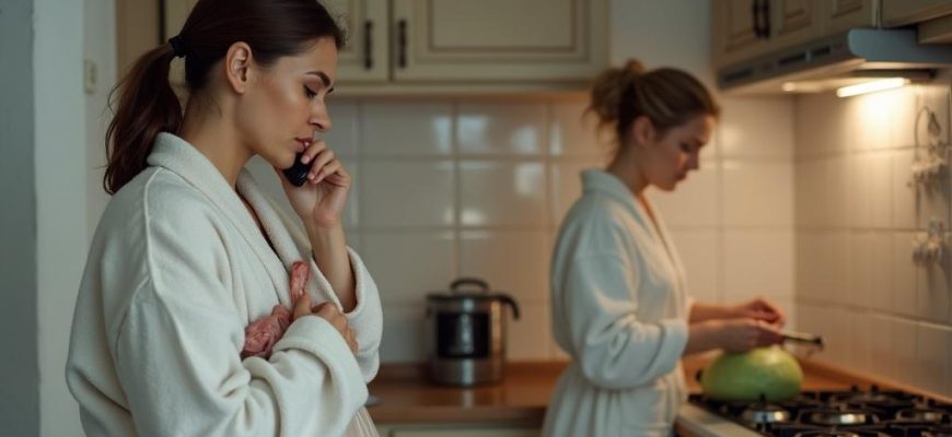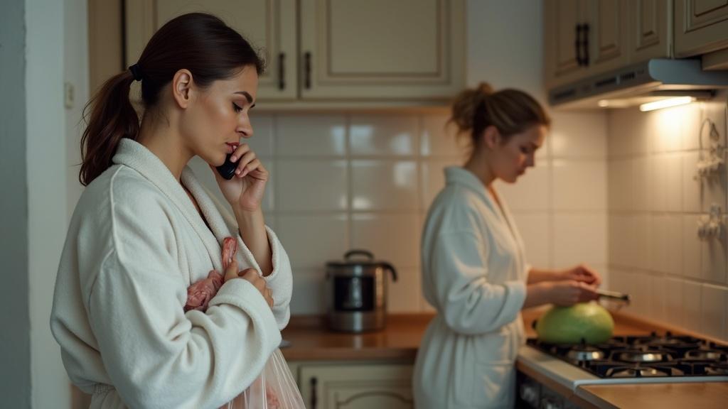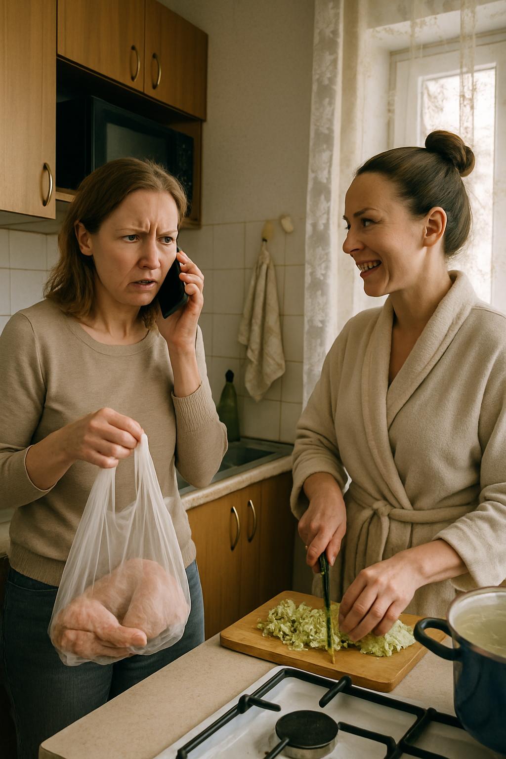 Irena je samozavestno stala ob štedilniku, lica rdeča od vročine, lasje speti v čvrst čop, kot da je v lastnem stanovanju. Mateja pa je delovala, kot bi jo ujeli v policijskem poročilu — roke še v vrečki s piščancem, obraz napet, ustnice stisnjene v tanko črto.
